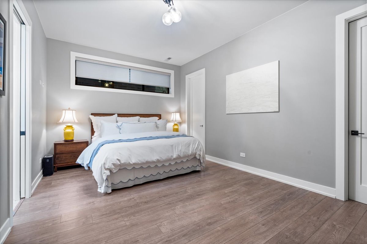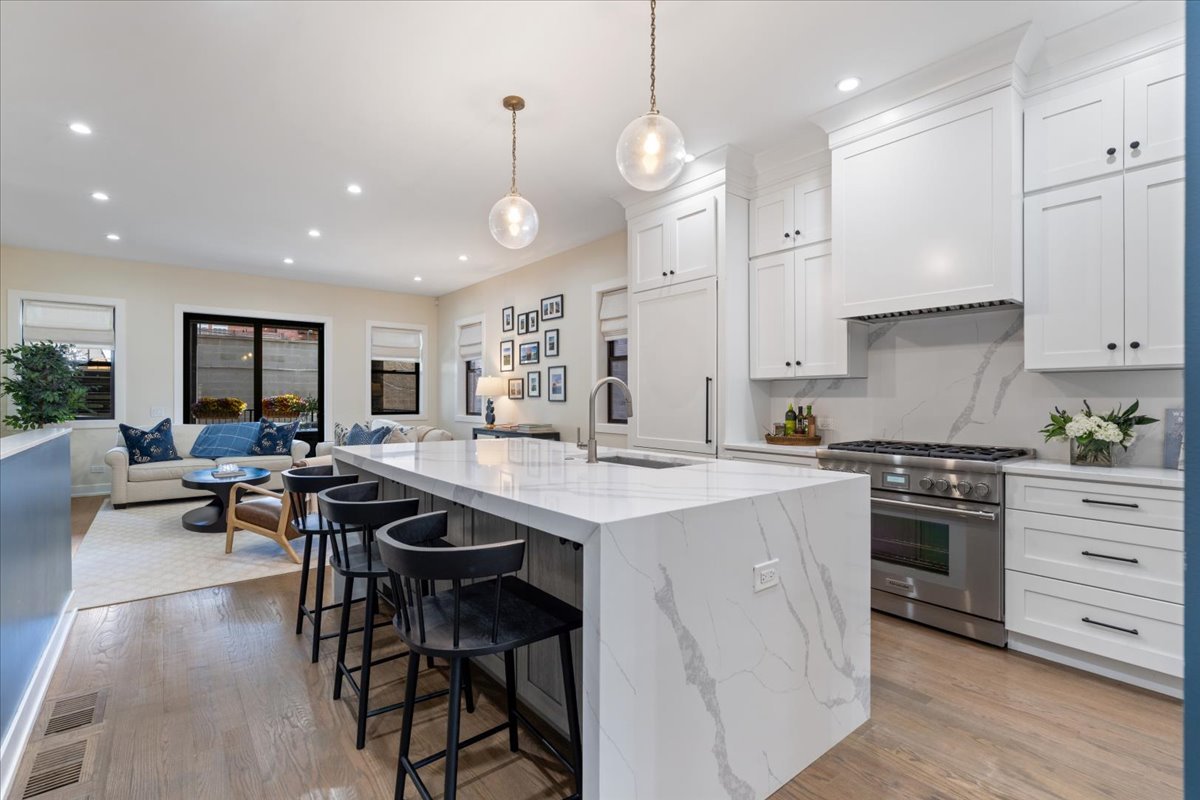 This 4-bedroom, 2.1-bath duplex-down offers a rare indoor/outdoor living in the heart of Lincoln Park. Enjoy over 800+ square feet of private outdoor living, including a covered terrace ideal for year-round use, plus a second expansive garage roof deck with composite decking, perfect for entertaining, relaxing, or dining. The private front entry and front porch add to the home's unique appeal. This newer all-masonry building lives like new construction, showcasing high-end finishes, oversized Pella windows, and designer details, including curated wallpaper and custom window treatments, along with exceptional craftsmanship throughout. The main level features a fabulous open floor plan designed for everyday living and entertaining. A stunning kitchen anchors the space with professional-grade appliances, quartz countertops with full backsplash, a dramatic waterfall island with seating, custom cabinetry, designer lighting, a pantry, and a built-in coffee bar. The lower level offers heated floors with four bedrooms and a full laundry room with sink. The serene primary suite is filled with natural light and features two large walk-in closets, and a spa-caliber bath with dual vanities, and an oversized steam shower with rain and handheld features. The additional bedrooms are well-sized and versatile, ideal for guests, children, or a home office, and share a beautifully appointed bathroom with dual vanity and soaking tub. Situated on a quiet, tree-lined street just steps from truly the best of Lincoln Park living.